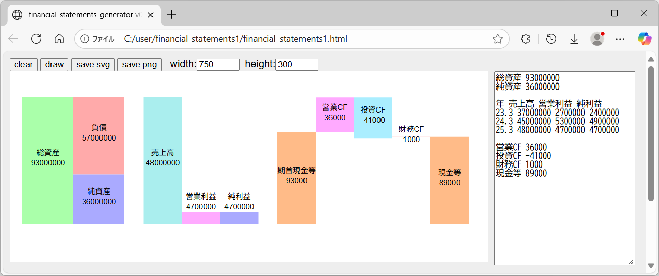 [draw] ボタンをクリックすると、入力された財務データに基づきグラフを描画します。